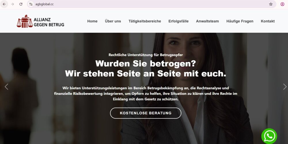 Der Hype um Kryptowährungen und schnelle Geld-Rückholung lockt leider auch immer mehr Betrüger an. **agbglobal.cc** (auch AGB Global CC oder Allianz Gegen Betrug) gibt sich als professionelle Hilfe bei Anlage- und Kryptobetrug aus – doch es handelt sich um einen klassischen **Recovery Scam**. Opfer, die bereits Geld bei Brokern verloren haben, werden ein zweites Mal abgezockt: Durch falsche Versprechen und Vorauszahlungen verschwindet das restliche Ersparte. Die Watchlist Internet warnt seit dem 16. Februar 2026 explizit davor: Diese „Anwaltskanzlei“ ist reine Fassade für Kriminelle.